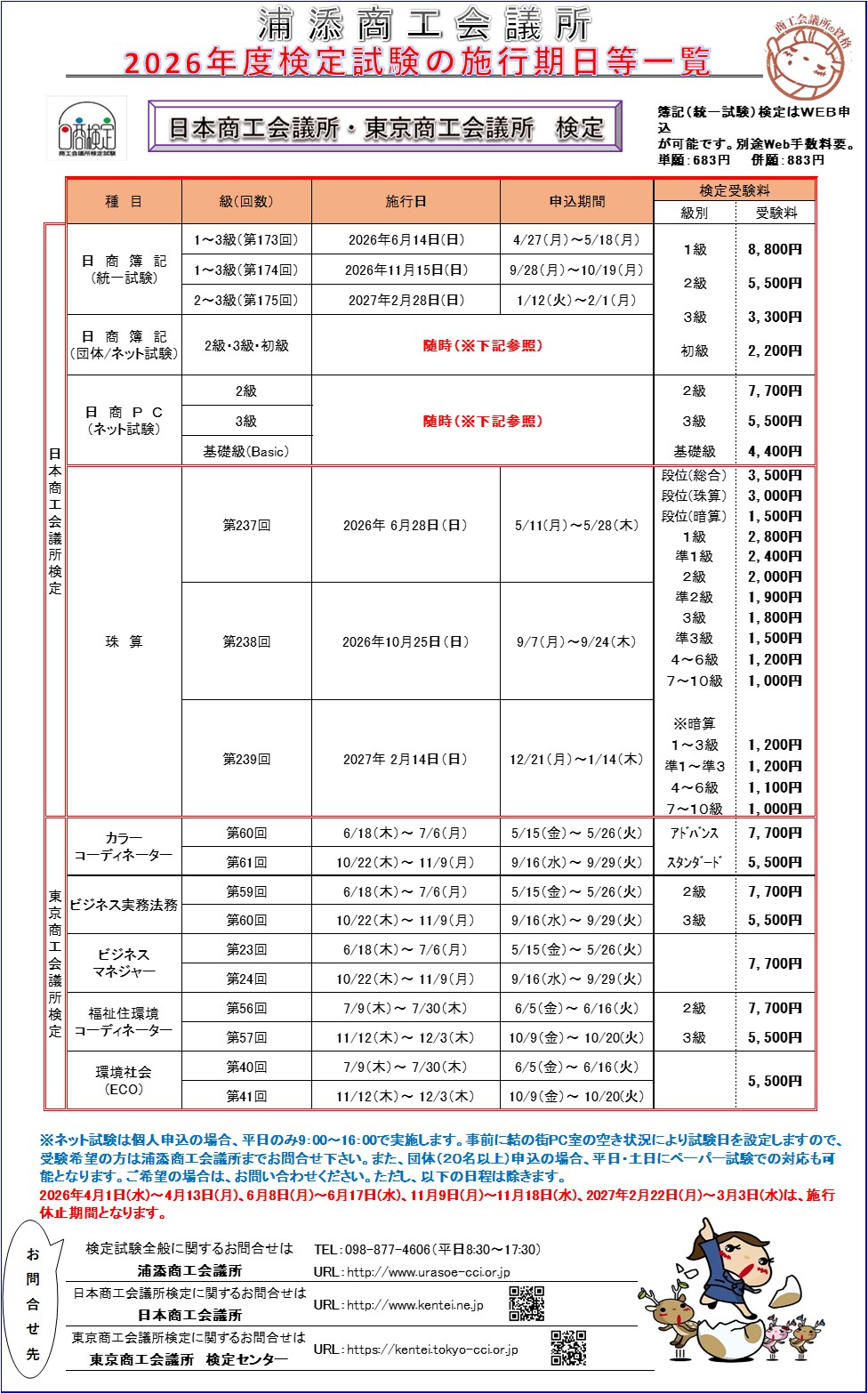 2026年度 浦添商工会議所ネット試験施行予定日を更新いたしました。