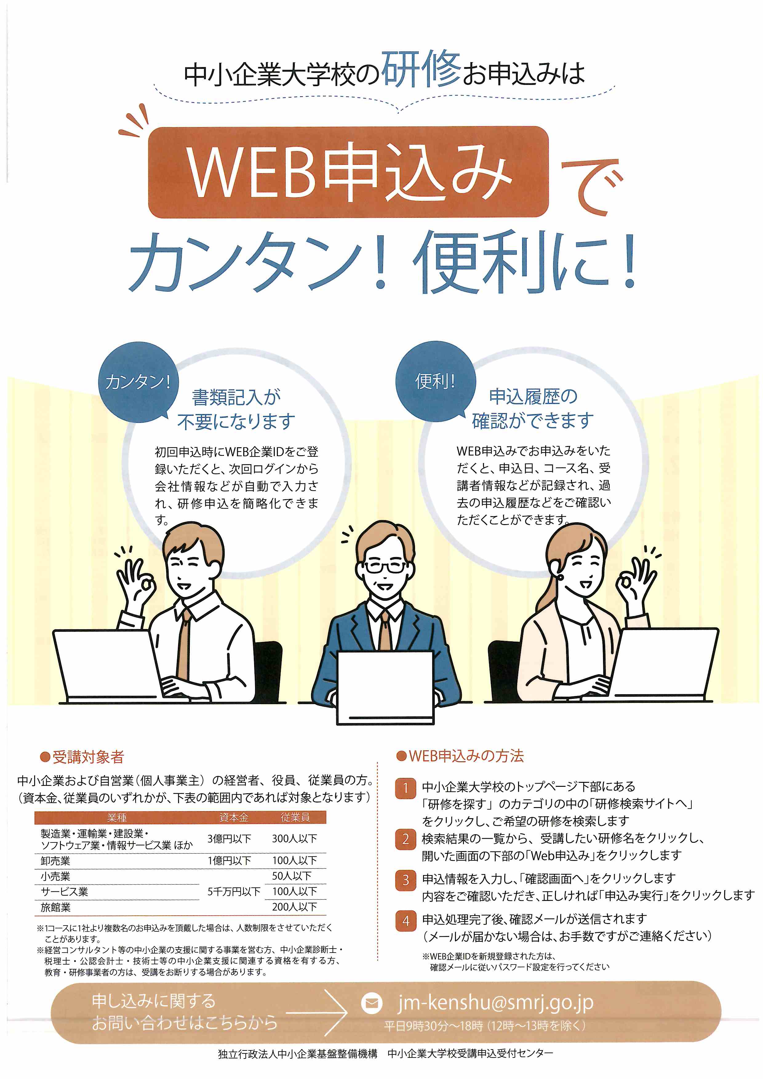 中小機構(独立行政法人 中小企業基盤整備機構)では、主に中小企業の人材育成と経営基盤の強化を目的として講習会(研修)を行っております。