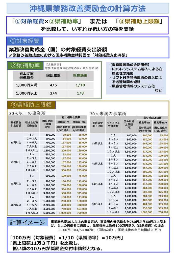 沖縄県では、賃金引上げとともに、生産性向上に資する設備投資等に取り組む県内中小企業者を支援するため、沖縄労働局の実施する「業務改善助成金」の支給決定を受けた事業者に対し奨励金を交付する「沖縄県業務改善奨励金事業」を下記のとおり実施いたします。